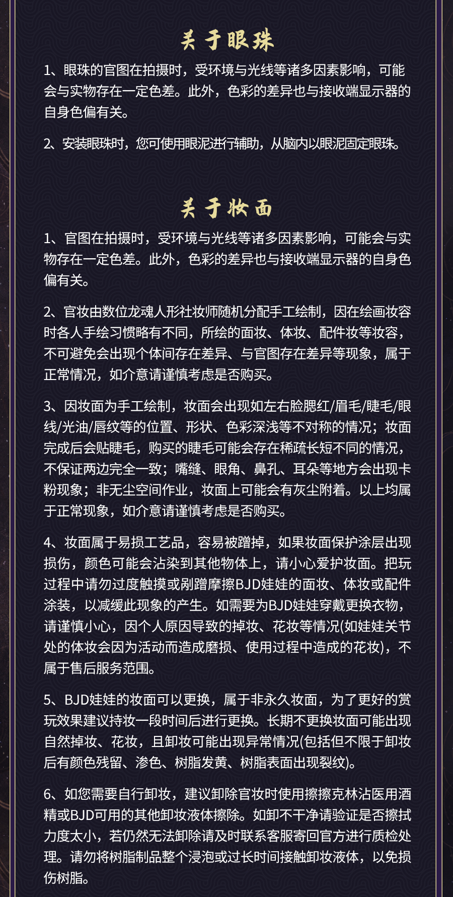 商品属性 [人形师] 龙魂创作团队 [官图身型] 75一代男体(1号脖围)、77男体 [分类] (1)大3分娃娃(63~80cm) [头围] 75/77 镜玄眠眼 3D版22.4cm BJD版:22.3cm 75/77 镜玄睁眼 3D版BJD版:22.4cm [官图眼珠] 70/73(14mm小虹膜) 75/77(16mm小虹膜) [官图肤色] 环保芙蓉白、环保黄肌 [全套] 开眼常服全套(黑色造型发)包含 :镜玄娃娃一尊【包含镜玄娃头一枚(不含面妆)、素体一体(含该身体原配手一对、原配脚一对)】、黑色造型发一顶、常服官服一套、鞋子一双、官眼(16mm小虹膜)一对、寒沁剑一柄。 眠眼睡衣全套(异色造型发)包含 :镜玄娃娃一尊【包含镜玄娃头一枚(不含面妆)、素体一体(含该身体原配手一对、原配脚一对)】、异色造型发一顶、睡衣官服一套。 [假发] 官方版造型发/时鱻版造型发