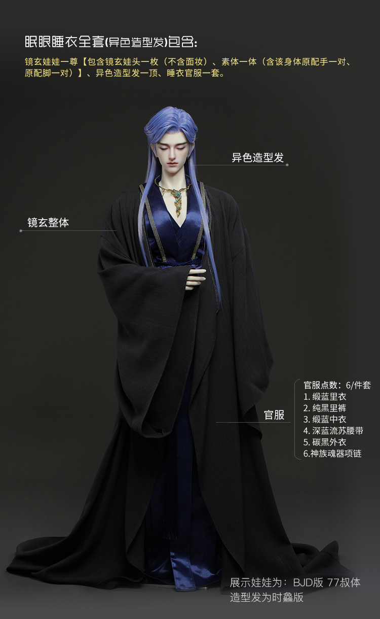 商品属性 [人形师] 龙魂创作团队 [官图身型] 75一代男体(1号脖围)、77男体 [分类] (1)大3分娃娃(63~80cm) [头围] 75/77 镜玄眠眼 3D版22.4cm 75/77 镜玄睁眼 3D版BJD版:22.4cm [官图眼珠] 70/73(14mm小虹膜) 75/77(16mm小虹膜) [官图肤色] 环保芙蓉白、环保黄肌 [全套] 开眼常服全套(黑色造型发)包含 :镜玄娃娃一尊【包含镜玄娃头一枚(不含面妆)、素体一体(含该身体原配手一对、原配脚一对)】、黑色造型发一顶、常服官服一套、鞋子一双、官眼(16mm小虹膜)一对、寒沁剑一柄。 眠眼睡衣全套(异色造型发)包含 :镜玄娃娃一尊【包含镜玄娃头一枚(不含面妆)、素体一体(含该身体原配手一对、原配脚一对)】、异色造型发一顶、睡衣官服一套。 [假发] 官方版造型发/时鱻版造型发