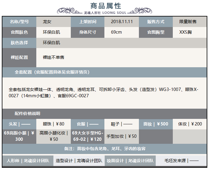商品属性 [官图胸型] XXS胸 [人形师] 龙魂创作团队 [分类] (1)大3分娃娃(63~80cm) [头围] 20cm [官图眼珠] 14mm小虹膜 [身高] 69cm [官图肤色] 环保白肌 [全套] 全套包括龙女裸娃一体、透明龙角、透明龙耳、可拆卸小牙齿、官发(造型发)WG3-1007、眼珠X-0027(14mm小虹膜)、官服69GC-0027 [妆面设计师] 龙魂创作团队 [服装品牌] 龙魂创作团队 [假发] 龙魂创作团队