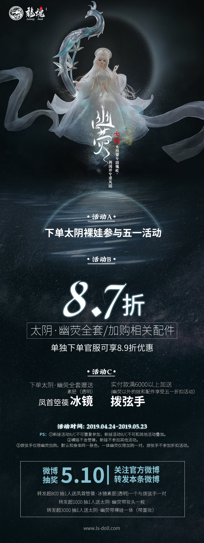 活动C:购买幽荧全套可获得凤首箜篌·冰境素胚(透明)一个,实付款满6000以上(幽荧以外的娃和配件享受五一折扣活动)加送拨弦手一对。