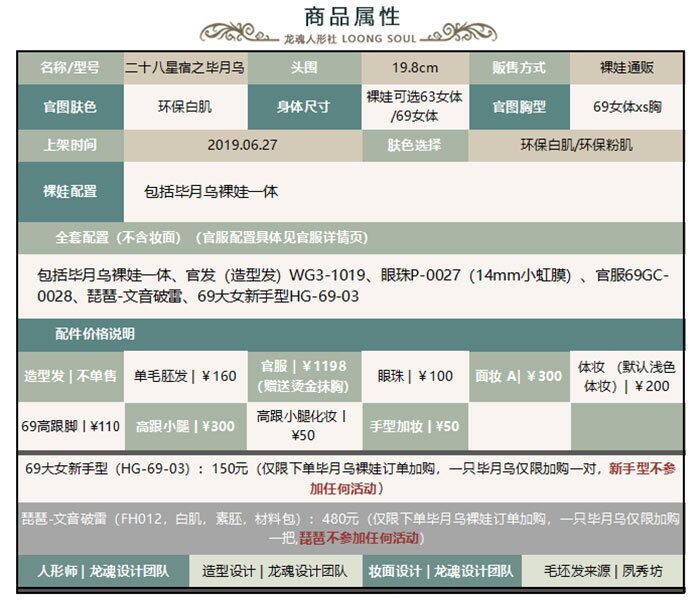 商品属性 [官图胸型] XS胸 [分类] (1)大3分娃娃(63~80cm) [头围] 19.8cm [官图眼珠] 14mm小虹膜 [官图肤色] 环保白肌 [全套] 全套包括毕月乌裸娃一体、官发(造型发)WG3-1019、眼珠P-0027(14mm小虹膜)、官服69GC-0028、琵琶-文音破雷(素胚)、69大女新手型HG-69-03 [妆面设计师] 龙魂创作团队 [服装品牌] 龙魂创作团队 [假发] 发胚发来源:夙秀坊