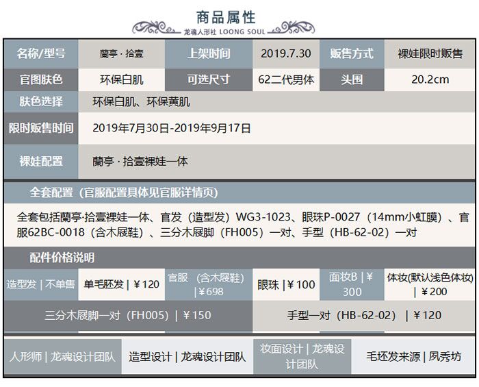 商品属性 [人形师] 龙魂创作团队 [分类] (1)大3分娃娃(63~80cm) [头围] 20.2cm [官图眼珠] 14mm(小虹膜) [官图肤色] 环保白肌 [全套] 全套包括蘭亭·拾壹裸娃一体、官发(造型发)WG3-1023、眼珠P-0027(14mm小虹膜)、官服62BC-0018(含木屐鞋)、三分木屐脚(FH005)一对、手型(HB-62-02)一对 [妆面设计师] 龙魂创作团队 [服装品牌] 龙魂创作团队 [假发] 发胚来源:夙秀坊
