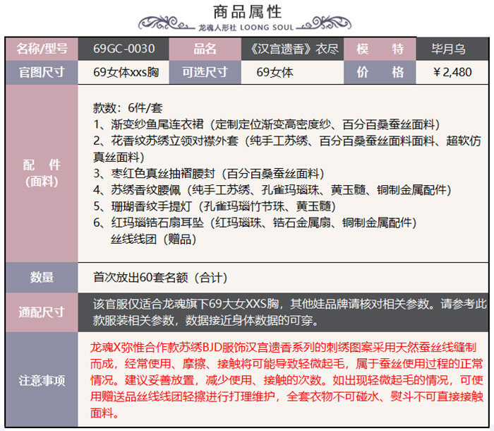 每个ID仅限拍付2个名额 本次汉宫遗香系列为非遗合作款,衣服皆由弥惟刺绣旗下绣娘采用苏绣中最难的绣种—细平绣,一针一线进行手工图案绣制。套装采用的是预售模式,制作发货周期为下单后的6-7个月,全套与服装单售发货周期一致,具体下单后请留意发货通知。