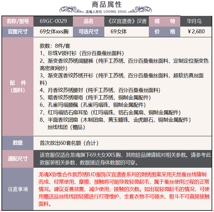 每个ID仅限拍付2个名额 本次汉宫遗香系列为非遗合作款,衣服皆由弥惟刺绣旗下绣娘采用苏绣中最难的绣种—细平绣,一针一线进行手工图案绣制。套装采用的是预售模式,制作发货周期为下单后的6-7个月,全套与服装单售发货周期一致,具体下单后请留意发货通知。
