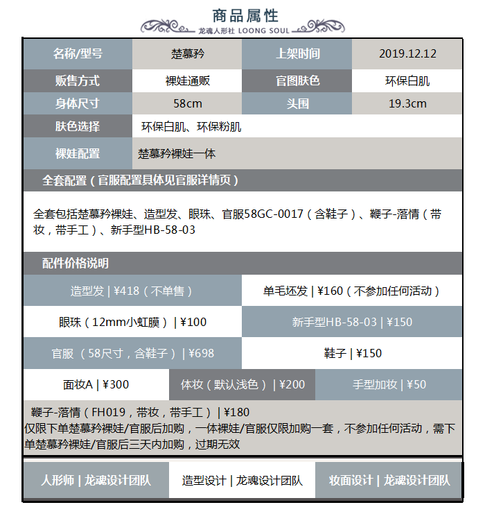 商品属性 [人形师] 龙魂创作团队 [分类] (2)3分娃娃(58~62cm) [头围] 19.3cm [官图眼珠] 12mm小虹膜 [身高] 58cm [官图肤色] 环保白肌 [全套] 全套包括楚慕矜裸娃、造型发WG3-1042、眼珠LH1008(12mm小虹膜)、官服58GC-0017(含鞋子)、鞭子-落情(FH019,带妆,带手工)、新手型HB-58-03 [妆面设计师] 龙魂创作团队 [服装品牌] 龙魂创作团队