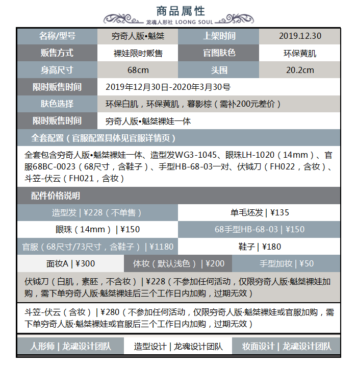 全套(不含妆):这次放出共90个名额其中官方渠道放出60个名额,代理及海外渠道放出名额30个。裸娃限时三个月,贩售时间:2019年12月30日-2020年3月30号