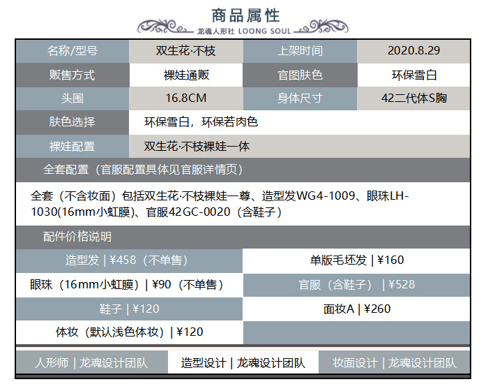 全套(不含妆面)包括双生花·不枝裸娃一尊、造型发WG4-1009、眼珠LH-1030(16mm小虹膜)、官服42GC-0020(含鞋子)