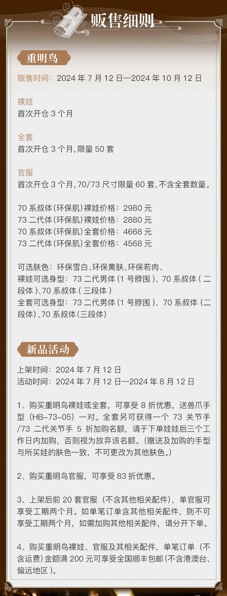 1、购买重明鸟裸娃或全套,可享受8折优惠,送兽爪手型(HB-73-05)一对。全套另可获得一个73关节手/73二代关节手5折加购名额,请于下单娃娃后三个工作日内加购,否则视为放弃该名额。(赠送及加购的手型与所买娃的肤色一致,不可更改为其他肤色。)