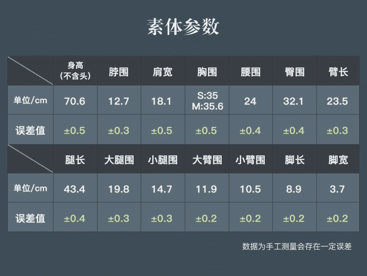 商品属性 [身高] 不含头70.6 [模特] 敦煌月影 [官图肤色] 环保黄肌 [官图胸型] S胸、三段体