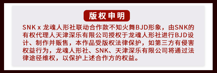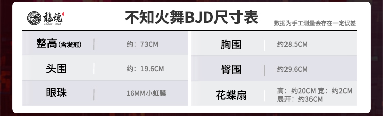 商品属性 [人形师] 龙魂创作团队 [官图身型] 69二代女体专属体 [分类] (1)大3分娃娃(63~80cm) [头围] 约19.6cm [官图眼珠] 16mm小虹膜 [官图肤色] 环保黄肤 [全套] 不知火舞娃娃一尊【包含不知火舞娃头一枚(含定制面妆)、69二代专属身体一体(含该身体原配手一对、原配脚一对)】、造型发(含发饰)LHWG3-S0041一顶、官服69GC-0034(含花蝶扇)一套、官眼LH-PE0018(16mm小虹膜)一对。 [妆面设计师] 龙魂创作团队 [服装品牌] 龙魂创作团队