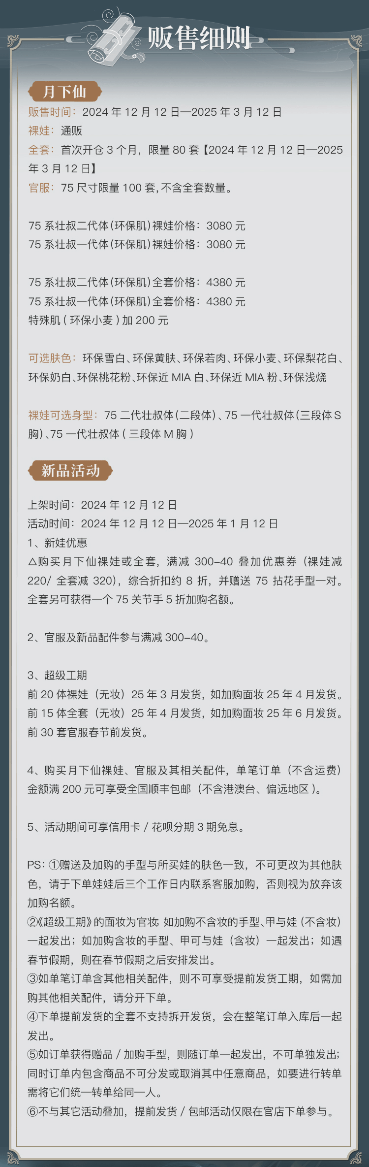商品属性 [人形师] 龙魂创作团队 [官图身型] 75一代男体(1号脖围、S胸、三段体) [头围] 约22.8cm [官图眼珠] 眼珠(16mm小虹膜) [官图肤色] 环保雪白 [裸娃] 裸娃(不含妆)包含:月下仙素头一枚、素体一体(含该身体原配手一对、原配脚一对) [全套] 全套(不含妆)包含:月下仙裸娃一体、造型发LHWG3-S0045(含发饰)、官服75BC-75a-0010、眼珠LH-PE0002(16mm小虹膜)、鞋子LH75SH-0006 [妆面设计师] 龙魂创作团队 [服装品牌] 龙魂创作团队