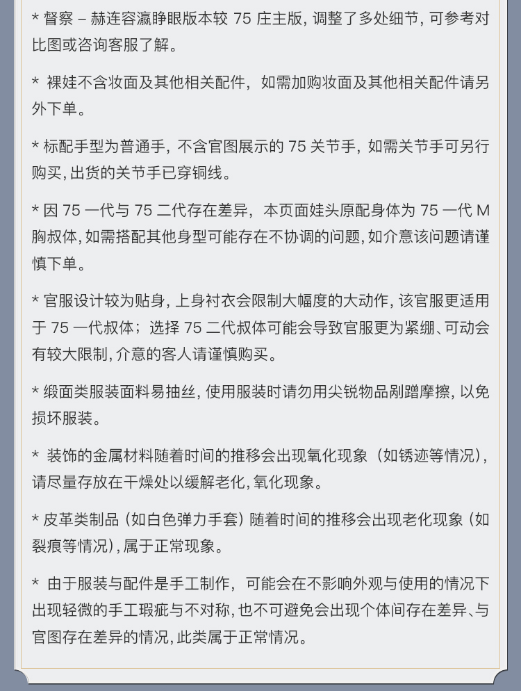 商品属性 [人形师] 龙魂创作团队 [官图身型] 75一代男体(1号脖围、M胸、三段体) [头围] 睁眼头围约 22.9cm [官图眼珠] 眼珠(16mm小虹膜) [官图肤色] 环保黄肌 [裸娃] 裸娃(不含妆)包含:督察-赫连容瀛素头一枚、素体一体(含该身体原配手一对、原配脚一对) [全套] 全套(不含妆)包含:督察-赫连容瀛裸娃一体、造型发LHWG3-S0040、官服71YF-B022 [妆面设计师] 龙魂创作团队 [服装品牌] 龙魂创作团队