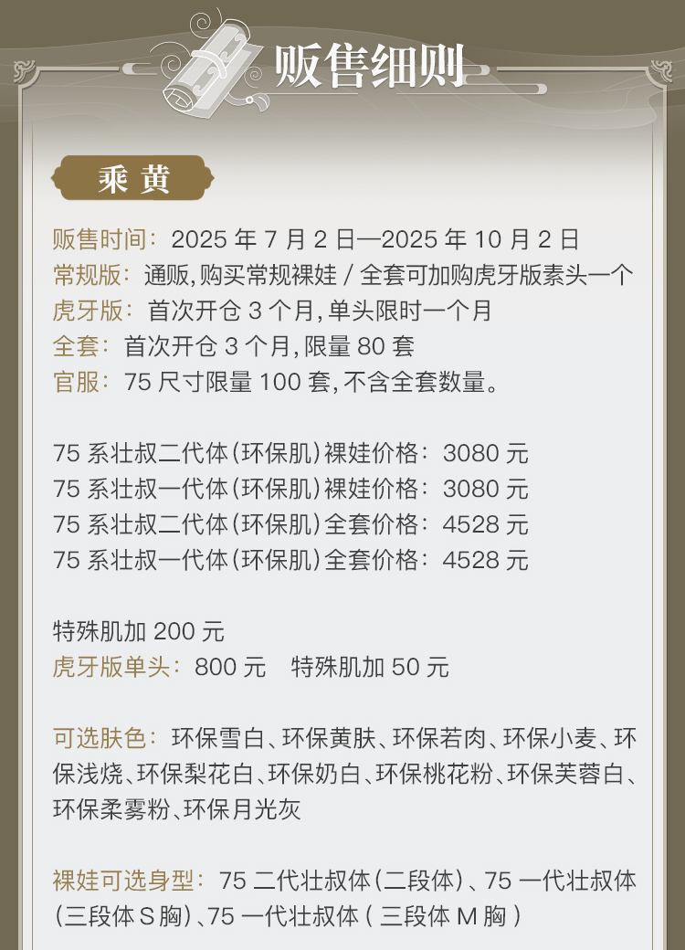 商品属性 [人形师] 龙魂创作团队 [官图身型] 75一代壮叔体(三段体S胸) [头围] 头围 约23.3cm [官图眼珠] 眼珠(16mm小虹膜) [官图肤色] 环保黄肌 [裸娃] 裸娃(不含妆)包含:乘黄素头一枚、素体一体(含该身体原配手一对、原配脚一对) [全套] 全套(不含妆)包含:乘黄裸娃一体、腾黄角(含妆)LHAP-0067、造型发LHWG3-S0053、官服(含尾巴)75BC-75a-0013 [妆面设计师] 龙魂创作团队 [服装品牌] 龙魂创作团队