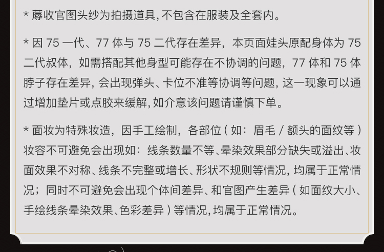 商品属性 [人形师] 龙魂创作团队 [官图身型] 75二代壮叔体(二段体) [头围] 约23cm [官图眼珠] 眼珠(16mm小虹膜) [官图肤色] 环保若肉色 [裸娃] 裸娃(不含妆)包含:蓐收素头一枚、素体一体(含该身体原配手一对、原配脚一对) [全套] 蓐收裸娃一体、造型发黑水母(@时鱻制作出货)、官服月弥·夜(含头饰)(@月香阁娃衣社制作出货) [妆面设计师] 龙魂创作团队 [服装品牌] 龙魂创作团队