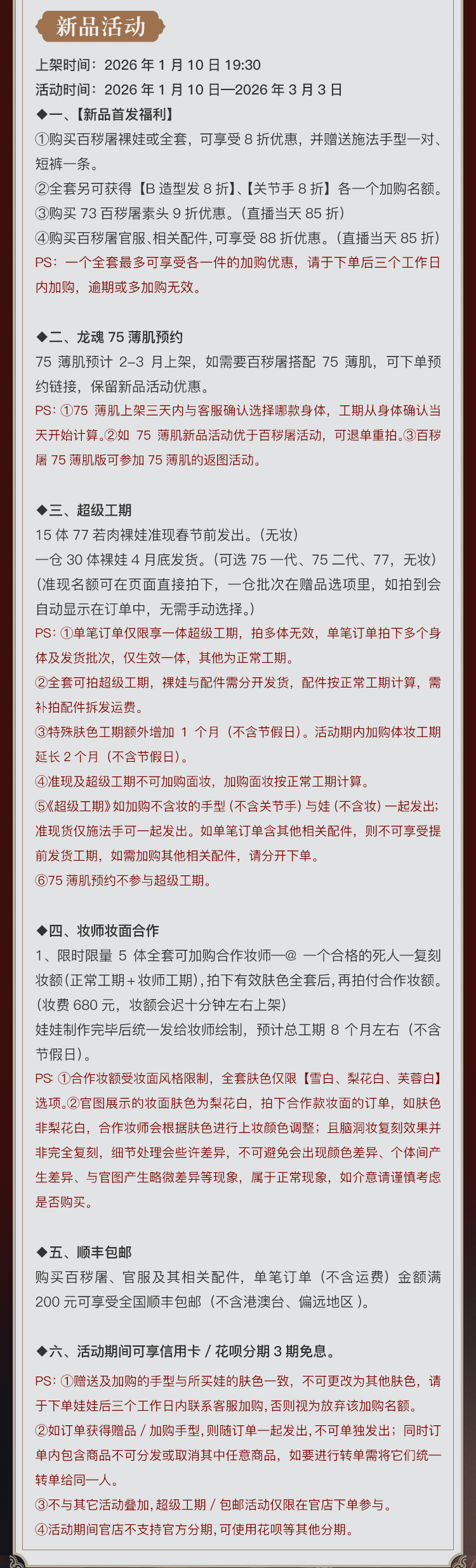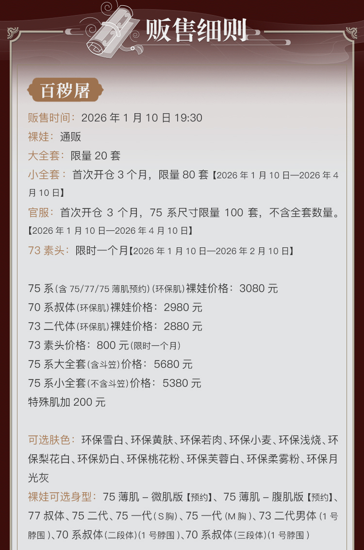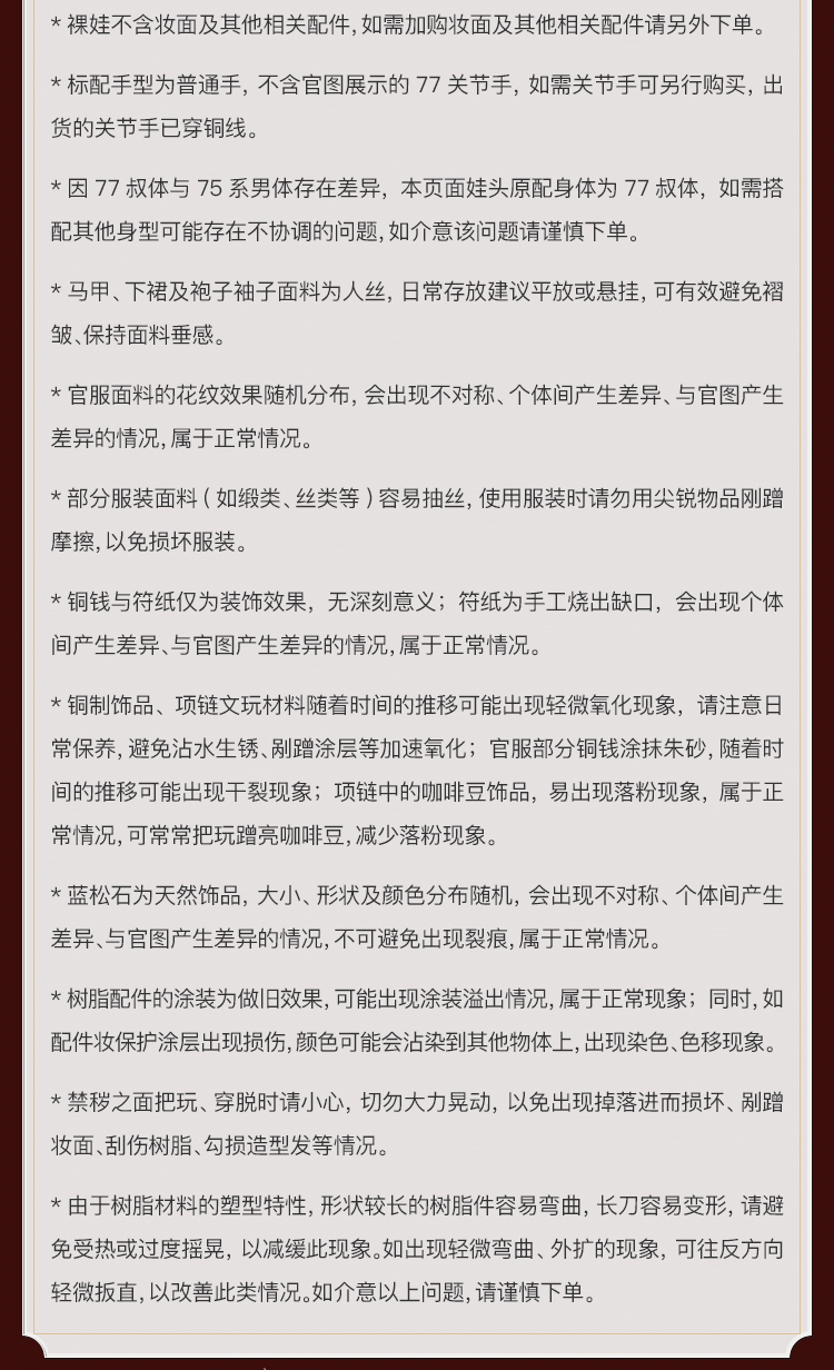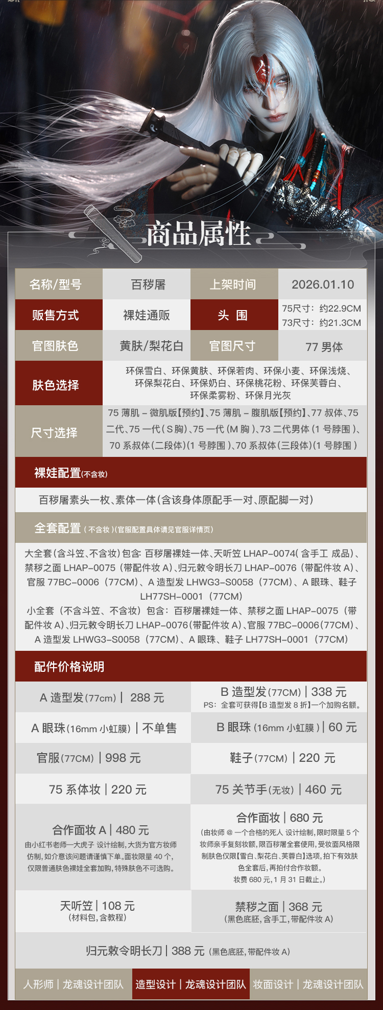 商品属性 [人形师] 龙魂创作团队 [官图身型] 77叔体 [头围] 75尺寸:约22.9CM 73尺寸:约21.3CM [官图眼珠] 眼珠(16mm小虹膜) [官图肤色] 环保黄肌/环保梨花白 [裸娃] 裸娃(不含妆)包含:百秽屠素头一枚、素体一体(含该身体原配手一对、原配脚一对) [全套] 大全套(含斗笠、不含妆)包含:百秽屠裸娃一体、天听笠(含手工 成品)、禁秽之面(带配件妆A)、归元敕令明长刀(带配件妆A)、官服、A造型发、A眼珠、鞋子 小全套(不含斗笠、不含妆)包含:百秽屠裸娃一体、禁秽之面(带配件妆A)、归元敕令明长刀(带配件妆A)、官服、A造型发、A眼珠、鞋子 [妆面设计师] 龙魂创作团队 [服装品牌] 龙魂创作团队